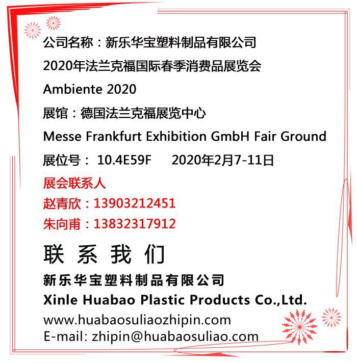2020年法蘭克福國際春季消費品展覽會/20.2.7-11/10.4E59F/誠邀您的參加! 上一個:全球抗新冠,華寶在行動 下一個:【拼搏2020】華寶集團(tuán)2019總結(jié)表彰暨2020迎新晚會圓滿結(jié)束