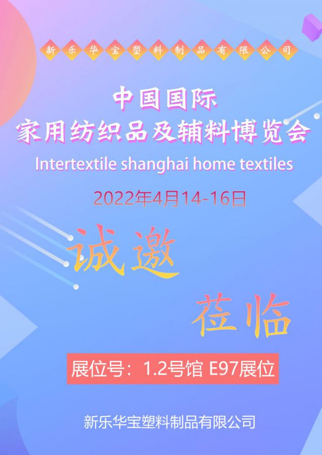 當前位置:網(wǎng)站首頁 新聞動態(tài) 展會信息 新樂華寶塑料制品有限公司于2022年4月14-16日參加上海中國國際家用紡織品及輔料博覽會,誠邀您的參加!